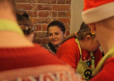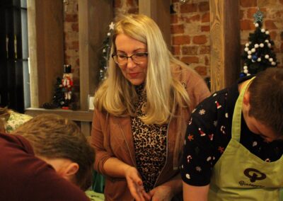 Uczestnicy przygotowywali świąteczne prace plastyczne, rozwijając wyobraźnię i zdolności manualne. Równolegle w słodkiej cukierni Pani Mikołajowej pieczone były świąteczne ciasteczka, których zapach szybko wypełnił całą pracownię.